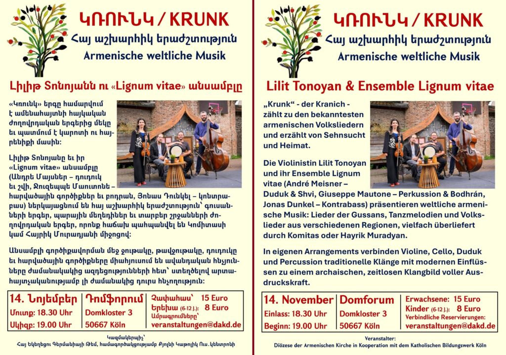 Lilit Tonoyan & Ensemble Lignum vitae präsentieren armenische weltliche Musik Freitag, 14. November 2025 Einlass: 18.30 Uhr, Beginn: 19.00 Uhr Domforum, Domkloster 3, 50667 Köln Erwachsene: 15 Euro, Kinder (6-12 J.): 8 Euro Verbindliche Reservierungen: veranstaltungen@dakd.de * Lilit Tonoyan […]