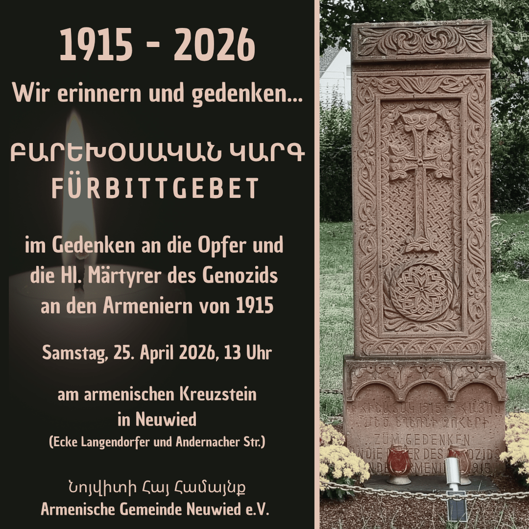 Genozid-Gedenken 2026 Ապրիլի 25 @ 13:00 - 13:30 Կրյուսթեյնը Գերմանիա, Նոյվիդ, Լանգենդորֆեր և Անդերնախեր փողոցի անկյուն